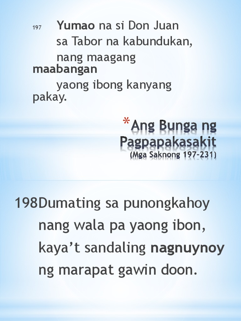 Daming bagay ang nabunyag. 346 Ang iyo pong bunsong anak. Anong linaw at liwanag Kaya sa tanang kaharap.